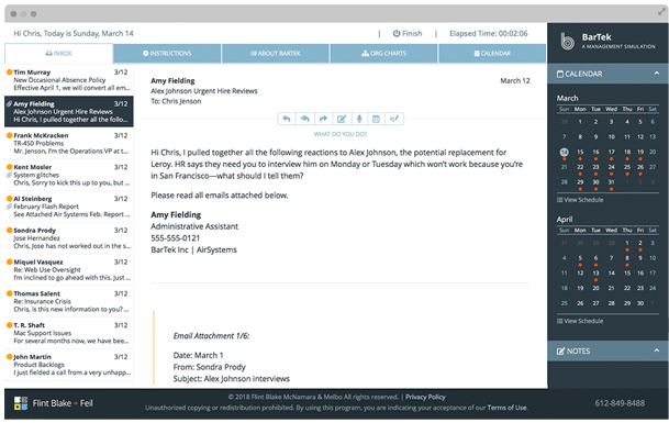 StartWelcomeBarTekA MANAGEMENT SIMULATION|BarTekA MANAGEMENT SIMULATION EXERCISEYou’re about to take on the role as Senior Vice President with BarTek Inc. You’ve come to work on Sunday so you can catch up before leaving on tomorrow’s flight. Your goal is to get through all your emails in an hour and a half. We're confident you can do it.FIRST LET'S TAKE A TOURTour the ProgramPREVIEW BEFORE STARTINGBe sure to watch this video preview and familiarize yourself with our management simulation program before starting. Find out what’s in it and how everything works, you’ll be glad you did. After viewing the video, scroll to the bottom to begin the exercise.I HAVE SEEN THE VIDEOClick the hourglass above to begin the exercise.BY CLICKING THE HOURGLASS, YOU AGREE TO THE THE TERMS OF USE. Privacy Terms of Use|